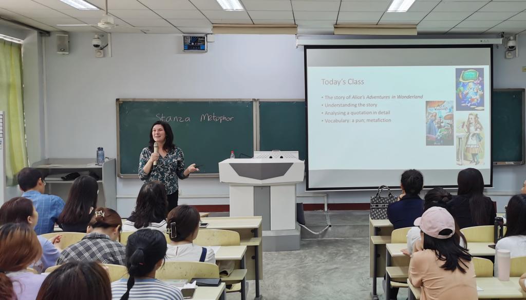 梅德赫斯特博士的两场讲座分别以《浪漫主义导论》和《〈爱丽丝漫游仙境〉导读》为题。在第一场讲座中,她用形象生动的语言为师生们介绍了十八世纪末至十九世纪初英国浪漫主义文学代表诗人及其主要思想,阐释了浪漫主义的主要特征及创作风格,并赏析了部分代表性诗歌。在第二场讲座中,她以英国著名儿童文学作品《爱丽丝漫游仙境》为例,从轻松诙谐的角色描写到“双关语”所蕴含的深意等多角度解释了十九世纪英国儿童文学的特点。她的讲座旁征博引、充满激情、幽默风趣,给师生们留下了深刻印象。