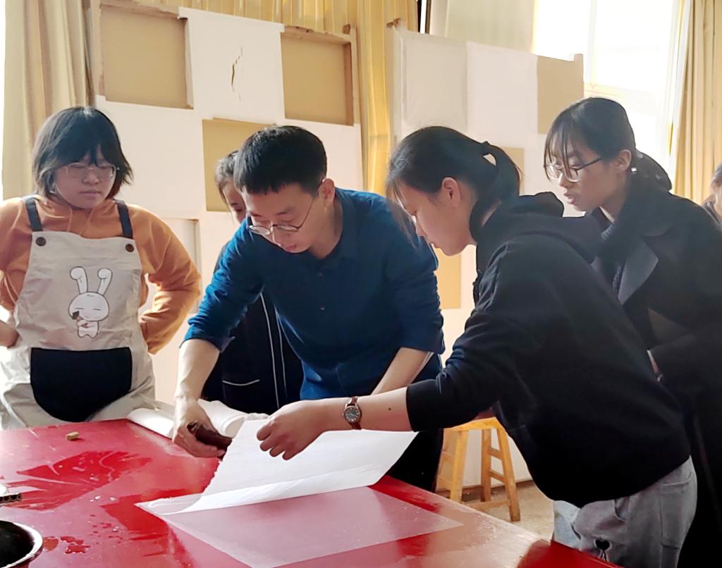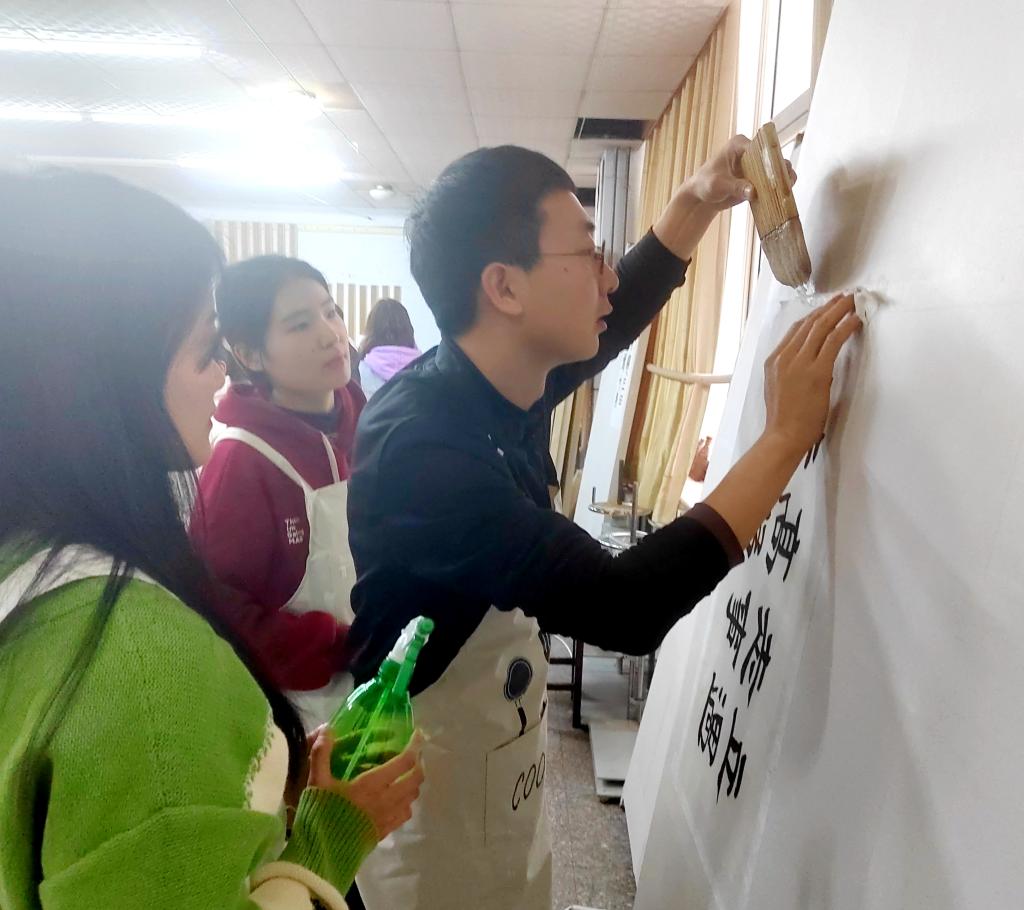 工欲善其事必先利其器。书画装裱是一门精深的手工艺术,既用于书画、碑拓的保护和美化,也用于古籍和古字画的修复,讲授这门课程时,王海蛟带着学生用一周时间把工作室内的大墙修复完成,接下来详细指导学生制作传统装裱的浆糊、手工托裱画心技能、方裁画心、搭配选取装饰材料、镶接技艺等。