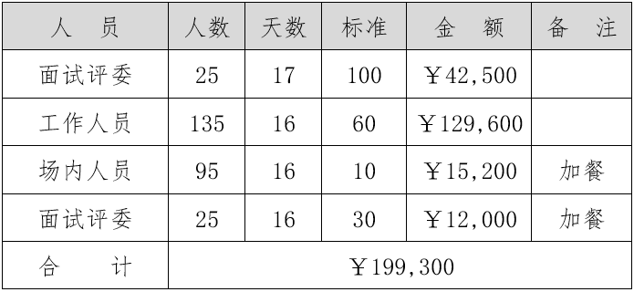 供餐期限自2023年1月30日至2023年2月15日,评委需17天的中餐和晚餐,全体测试工作人员16天的早、中、晚餐,面试评委及场内工作人员测试期间加餐(上午、下午各送一次),具体内容详见下表:
