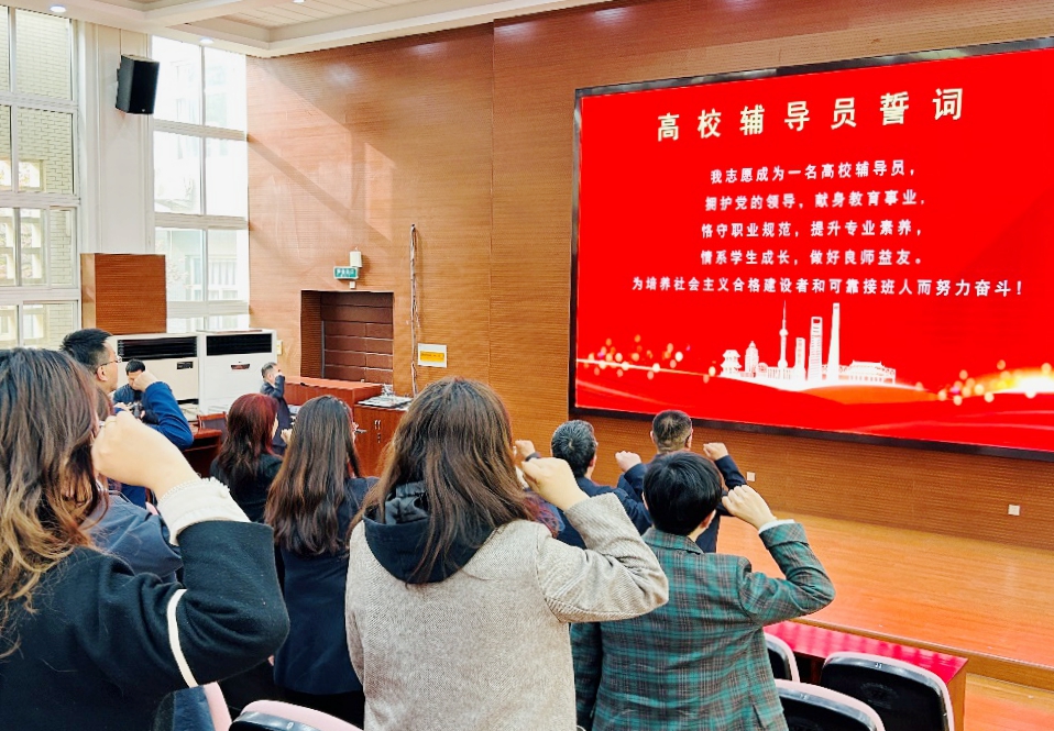 观影后,全体与会者一起重温高校辅导员誓词,表达了奉献教育事业、全心全意服务学生成长的坚定决心。